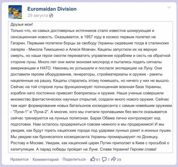 .....между прочим, украинские звездочеты уже зафиксировали старт флотилии подкрепления в районе озера нежности (северо-восточная часть видимой стороны Луны), но попали под плотный обстрел батальона анунаков "Крокодил Гена", воюющих на стороне ополченцев ДНР. Ведутся ожесточенные бои. Сепаратистами сбит флагманский дирижабиль.